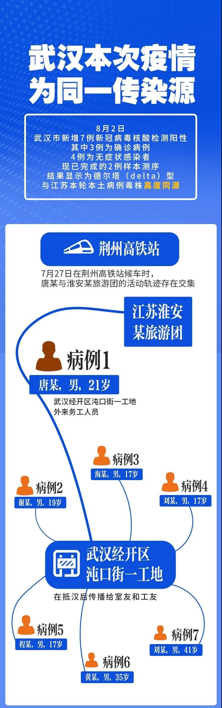 8月1日晚上,武汉经开区在对淮安某旅游团重点区域驻留人员排查中,发现沌口街一工地外来务工人员唐某,曾于7月27日在荆州高铁站候车时,与淮安某旅游团的活动轨迹存在交集。8月2日上午,唐某及与其密接的6名人员核酸检测阳性。同期,安徽一工地查出2名密接者轨迹,已追踪隔离51人。