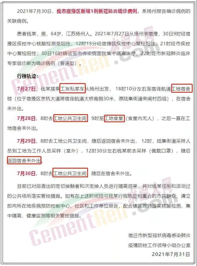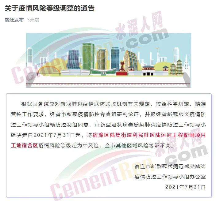 7月30日,江苏宿迁一工地宿舍确诊1例新冠肺炎病例,7月31日,将该宿舍区疫情风险等级定为中风险。