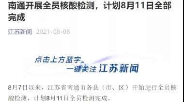 江苏南通:8月7日以来,江苏省南通市各县(市)区开始进行全员核酸检测,计划8月11日全员检测完成。