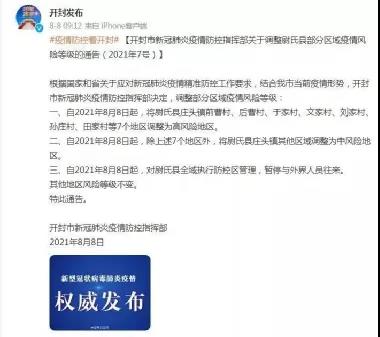 河南开封:自2021年8月8日起,将尉氏县庄头镇前曹村、后曹村、于家村、文家村、刘家村、孙庄村、田家村等7个地区调整为高风险地区;除上述7个地区外,将尉氏县庄头镇其他区域调整为中风险地区。对尉氏县全域执行防控区管理,暂停与外界人员往来。