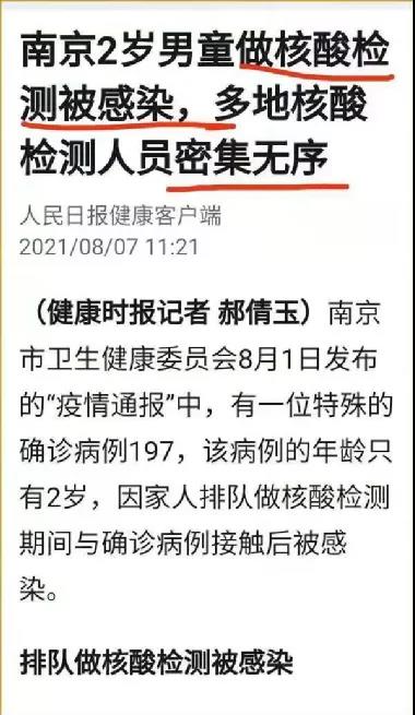 多地群众反应,检测现场乱糟糟的一堆人拥挤推搡,进展缓慢且队伍越来越长,部分熟人一同排队不戴口罩还唾沫横飞的聊天,哪顾得什么“一米线”的限制。南京某2岁男童随家人排队做核酸检测,期间家人与邻居有近距离交谈(接触确诊病例),后随家人与另一邻居在家后院交谈(接触确诊病例),此后被诊断为新冠肺炎确诊病例,让人倒吸一口凉气。