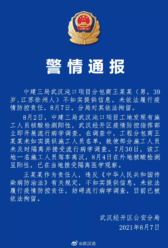 8月7日,武汉经开区公安分局发布警情通报:中建三局武汉沌口项目分包商王某某(男,39岁,江苏徐州人)不如实提供信息,未依法履行疫情防控责任,8月7日,分局对其依法拘留。
