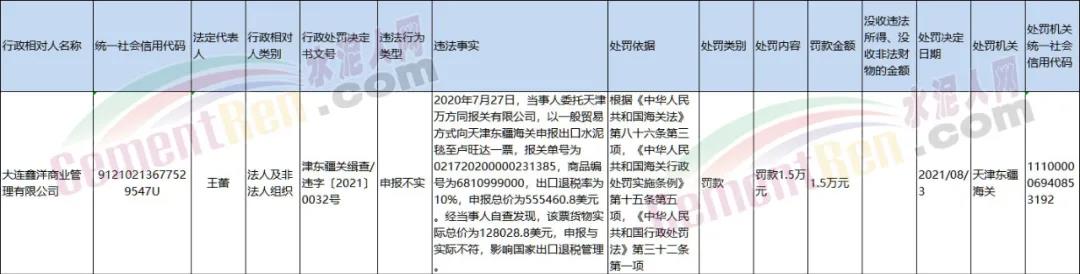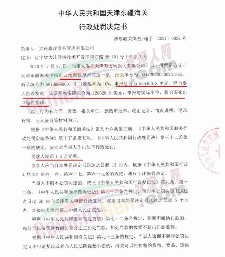 日前天津海关发布行政处罚决定书,其中提到出口水泥毯申请与实际不符,影响国家出品退税管理被处罚人民币1.5万元。
