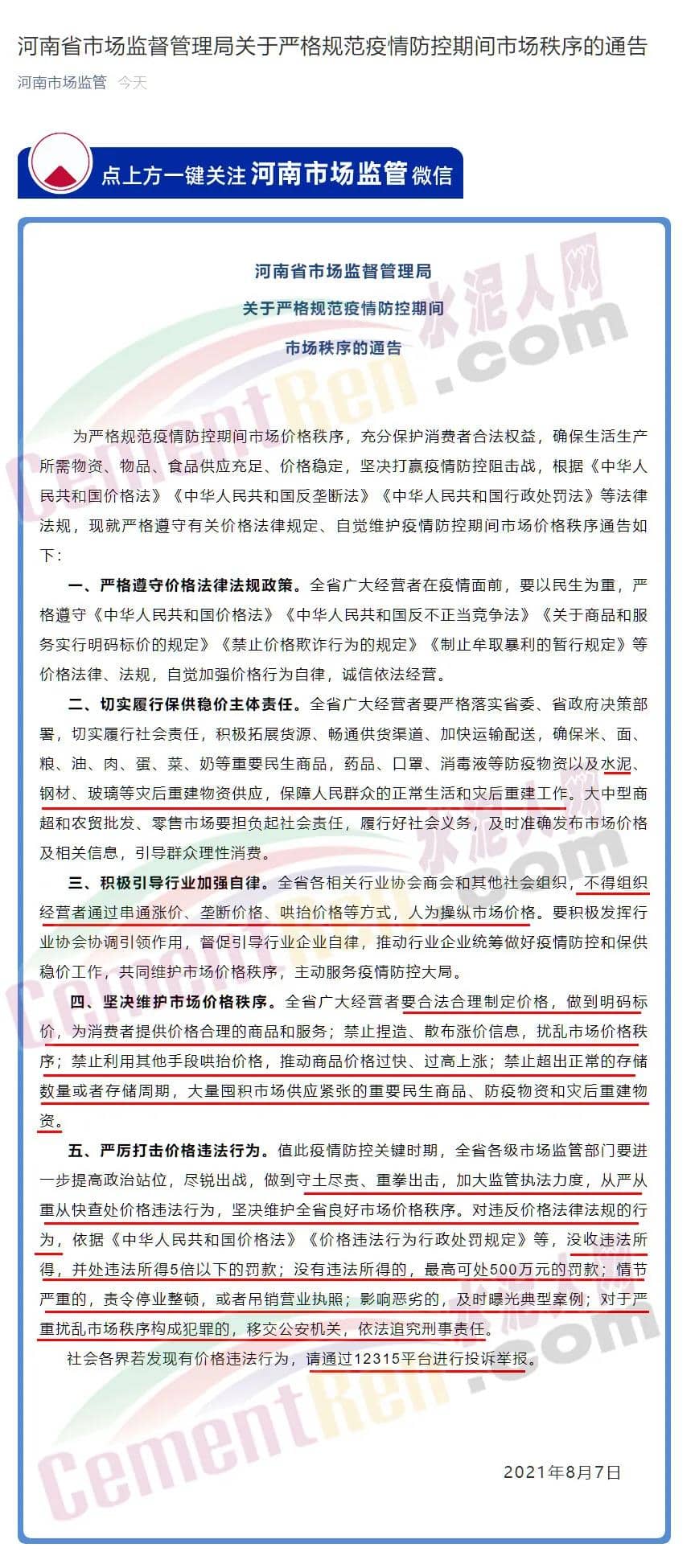 8月7日河南省市场监督管理局发布《关于严格规范疫情防控期间市场秩序的通告》称,为严格规范疫情防控期间市场价格秩序,充分保护消费者合法权益,确保生活生产所需物资、物品、食品供应充足、价格稳定,坚决打赢疫情防控阻击战,根据相关法律法规,就严格遵守有关价格法律规定、自觉维护疫情防控期间市场价格秩序作出通告。
