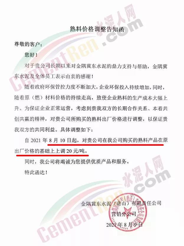 金隅冀东水泥唐山有限责任公司营销分公司通知,随着政府环保管控力度不断加大,企业环保投入持续增加,同时,随着原(燃)材料价格的持续走高,致使企业熟料的生产成本大幅上升。为保证企业正常运营,自8月10日起,对熟料产品在原出厂价格的基础上上调20元/吨。