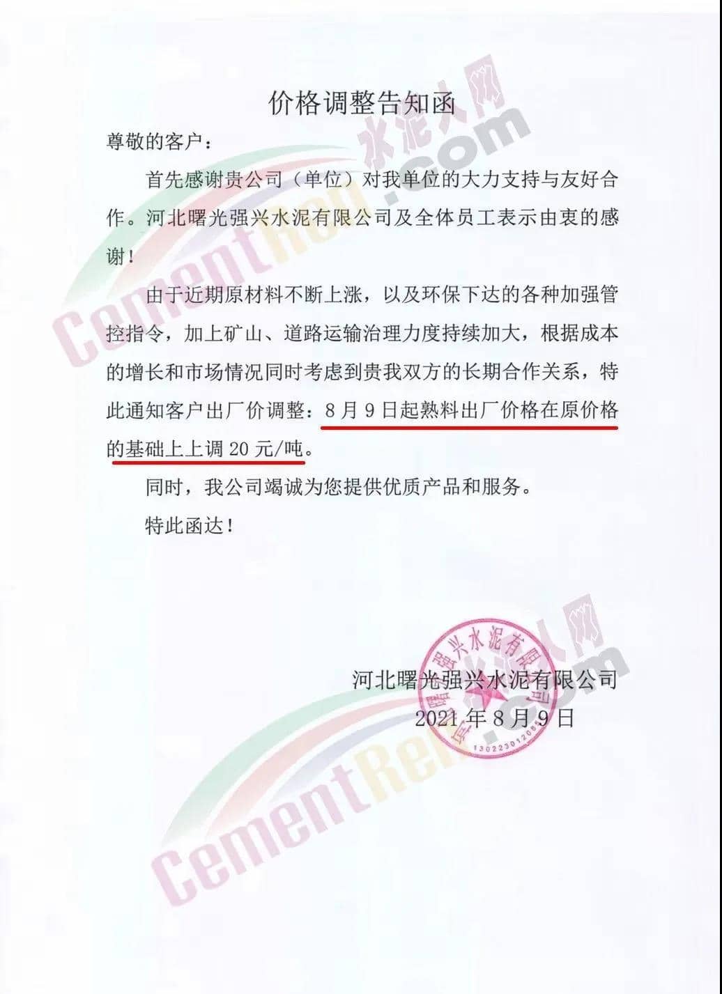 河北曙光强兴水泥有限公司通知,由于近期原材料不断上涨,以及环保下达的各种加强管控指令,加上矿山、道路运输治理力度持续加大,根据成本的增长和市场情况,自8月9日起熟料出厂价格在原价格的基础上上调20元/吨。