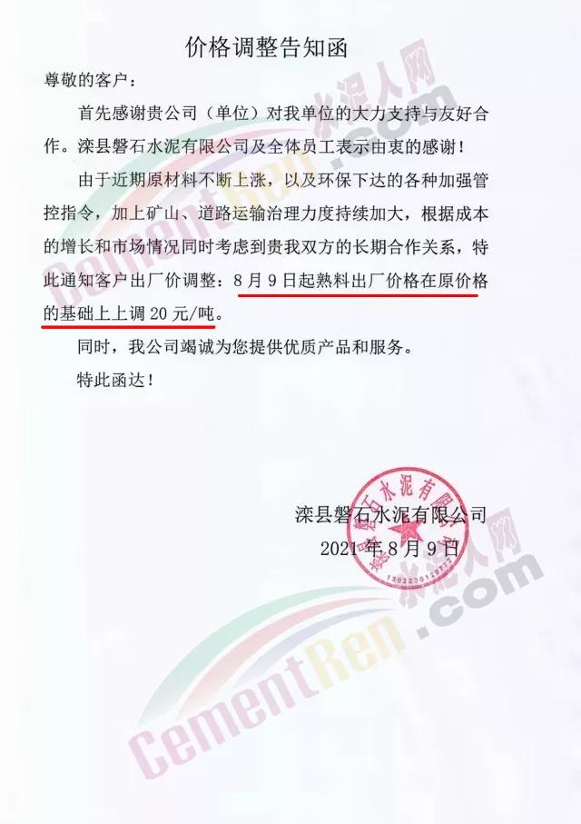 滦县磐石水泥有限公司通知,由于近期原材料不断上涨,以及环保下达的各种加强管控指令,加上矿山、道路运输治理力度持续加大,根据成本的增长和市场情况自8月9日起熟料出厂价格在原价格的基础上上调20元/吨。
