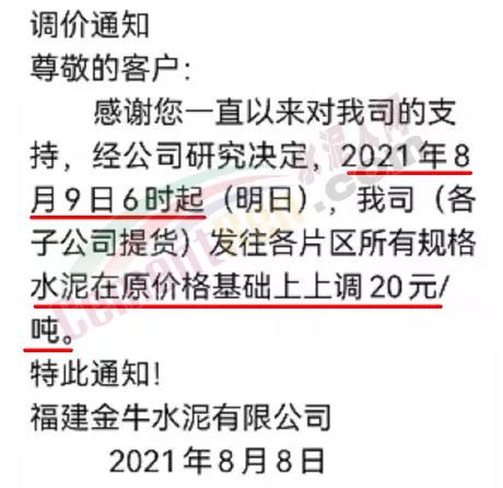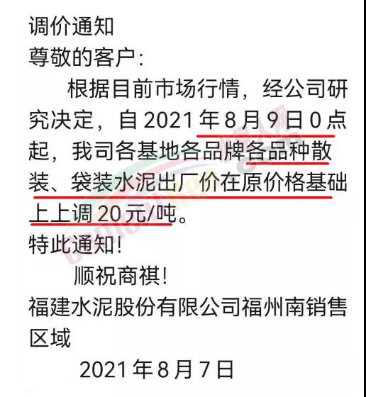 同日福建省内福建水泥、金牛水泥等多家企业通知自8月9日起上调水泥价格20元/吨。