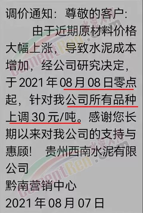 贵州西南水泥有限公司黔南营销中心通知,由于近期原材料价格大幅上涨,导致水泥成本增加,经公司研究决定8月8日零点起,所有品种上调30元/吨。