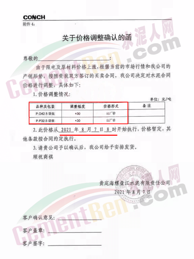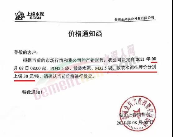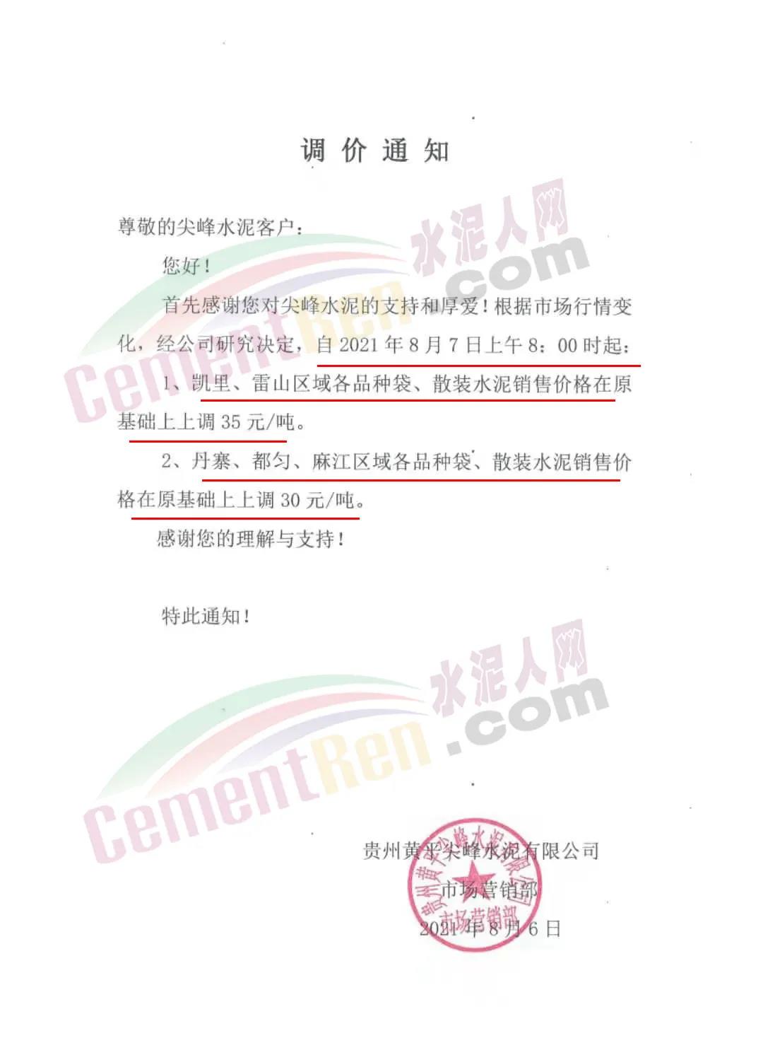 同日,企业又通知根据市场行情变化,经公司研究决定,自2021年8月7日上午8时起,凯里、雷山区域各品种袋、散装水泥销售价格在原基础上上调35元/吨;丹寨、都匀、麻江区域各品种袋、散装水泥销售价格在原基础上上调30元/吨。