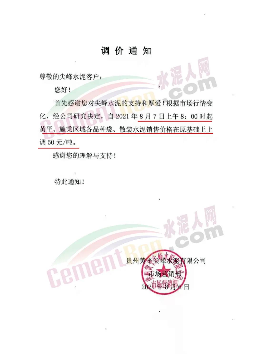 贵州黄平尖峰水泥有限公司市场营销部通知根据市场行情变化,经公司研究决定,自2021年8月7日上午8时起黄平、施秉区域各品种袋、散装水泥销售价格在原基础上上调50元/吨。