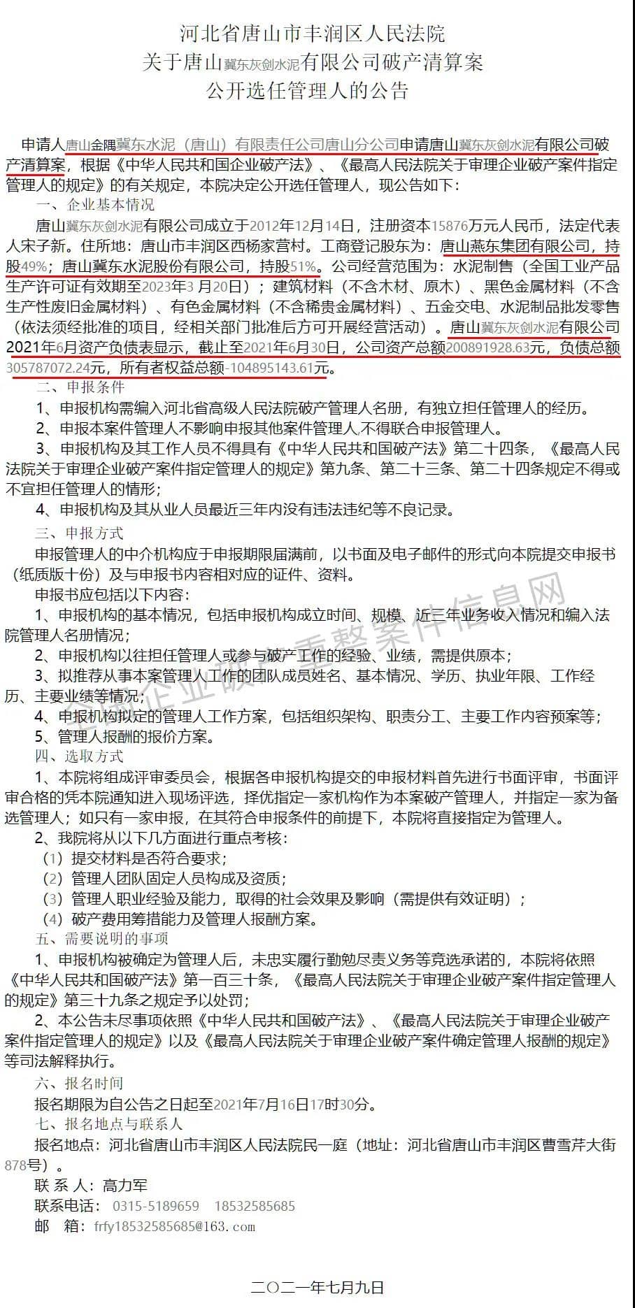 据水泥人网此前报道,7月9日河北省唐山市丰润区人民法院发布《关于唐山冀东灰剑水泥有限公司破产清算案公开选任管理人的公告》称,申请人唐山金隅冀东水泥(唐山)有限责任公司唐山分公司申请唐山冀东灰剑水泥有限公司破产清算案,河北省唐山市丰润区人民法院将公开选任管理人。