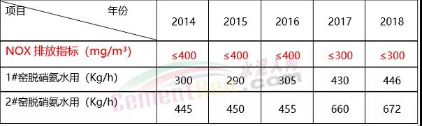 日照中联水泥拥有两条2*2500t/d新型干法水泥熟料生产线,采用窑外预分解旋窑生产工艺。应环保要求,2014年日照中联水泥增加SNCR脱硝系统降低NOX排放。使用初期,NOX排放指标为400mg/m³以下,脱硝氨水使用量1#窑约300Kg/h,2#窑约450Kg/h。在2017年NOX排放指标调整为300mg/m³以下,1#窑约430Kg/h,2#窑约650Kg/h,下表是2014年至2018年脱硝氨水消耗统计。