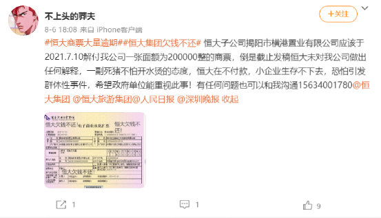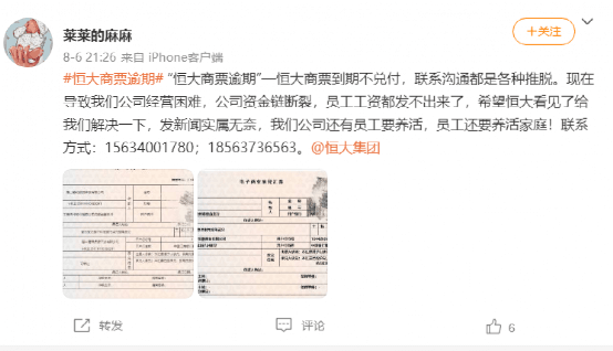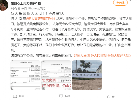 有网友在社交平台上留言称,恒大商票到期未付,令企业工资无法发出,被工人堵门,被逼贱卖机器设备。去年无奈收恒大商票,连云港恒大置业,南京恒大富丰。今年到期,逾期却迟迟不付,沟通几个月基本无效。