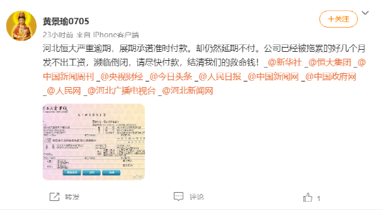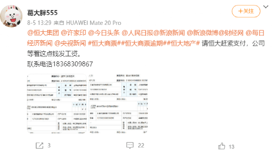 有网友在社交平台喊话恒大集团,许家印以及各大媒体平台:“请恒大赶快支付,公司等着这点钱发工资!”