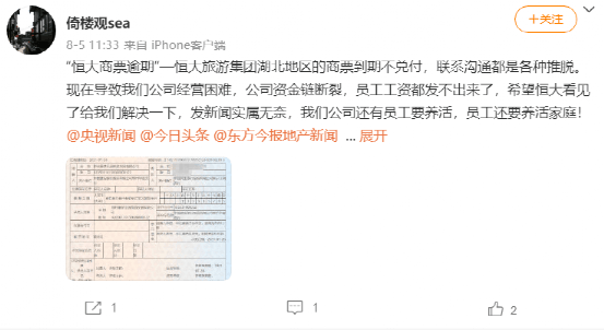 “恒大商票逾期,联系沟通都是推脱,导致公司经营困难,公司资金链断裂,员工工资发不出来了。”