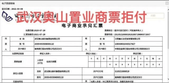 公开信息显示,奥山此次逾期的一批商票,出票人为奥山置业旗下子公司武汉奥山新印象置业有限公司,收票人为江阴鑫长达经贸发展有限公司,出票日期2020年7月29日,汇票到期日2021年7月29日,持票周期一年。票面金额50万元。