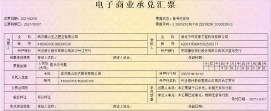另一持票人爆料,一张出票人为奥山置业旗下子公司武汉奥山圣达置业有限公司的商票已于8月6日逾期尚未兑付。收票人为湖北中科宏泰工程机械有限公司,出票日期2021年2月7日,汇票到期日2021年8月7日,持票周期半年。票面金额50万元。