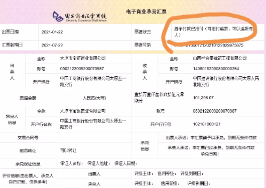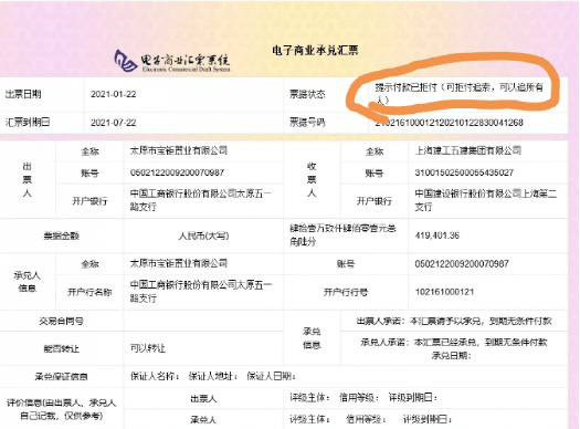同时,其还晒出了两份商业承兑汇票的截图,金额分别为40多万和10多万,出票人均显示为太原市宝钜置业有限公司,出票时间为2021年1月22日,到期日为2021年7月22日。票据状态为“提示付款已拒付”。