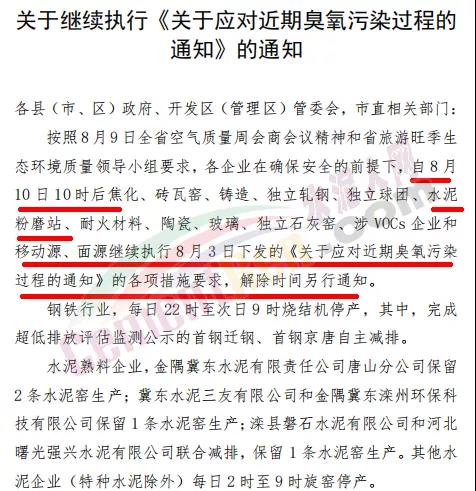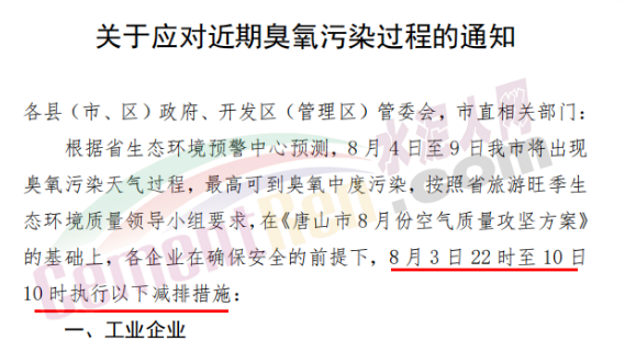 8月10日,唐山市大气污染防治工作领导小组办公室又发一文,即关于继续执行《关于应对近期臭氧污染过程的通知》的通知。