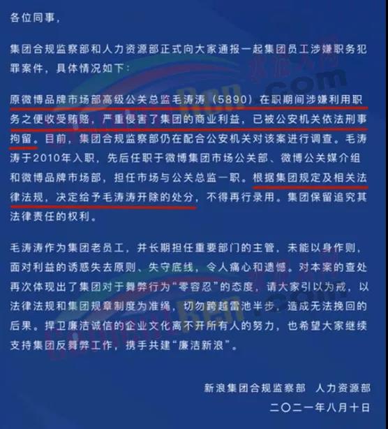 日前,新浪集团合规监察部人力资源部发布内部通报,称公司品牌市场部高级公关总监毛涛涛在职期间涉嫌利用职务之便收受贿赂,严重侵害了集团的商业利益,现已被公安机关依法刑事拘留。