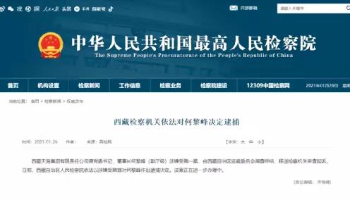 2021年1月26日,最高人民检察院官网发布消息:西藏天海集团有限责任公司原党委书记、董事长何黎峰(副厅级)涉嫌受贿一案,由西藏自治区监察委员会调查终结,移送检察机关审查起诉。何黎峰简历显示,他在2001年12月至2003年8月期间曾任西藏自治区天路股份有限公司党委书记、副董事长。