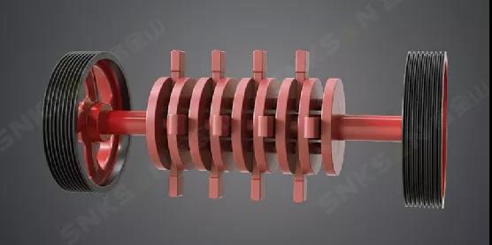 转子锤头由传统的50-70件降低至16-20件,降低了转子自重以及易损件数量。转子两侧设置大惯量皮带轮,增加了转子的运转惯性,降低了负载率。