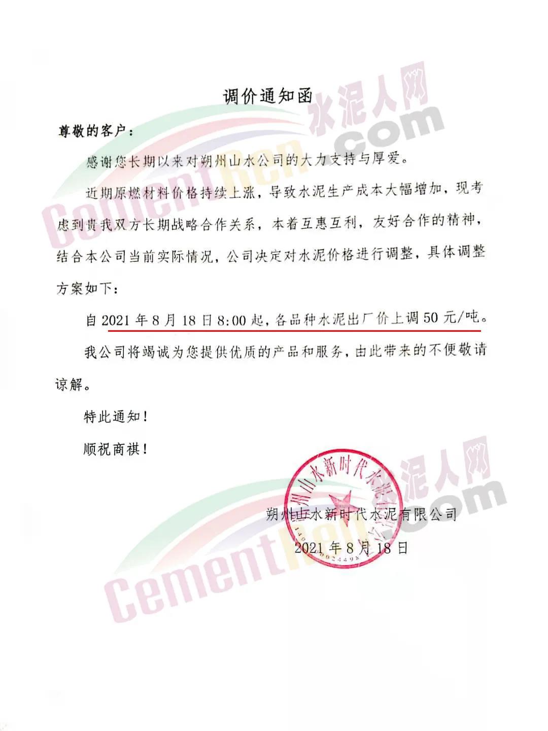 昨日(8月18日)朔州山水新时代水泥有限公司通知,近期原燃材料价格持续上涨,导致水泥生产成本大幅增加,自2021年8月18日8时起,各品种水泥出厂价上调50元/吨。