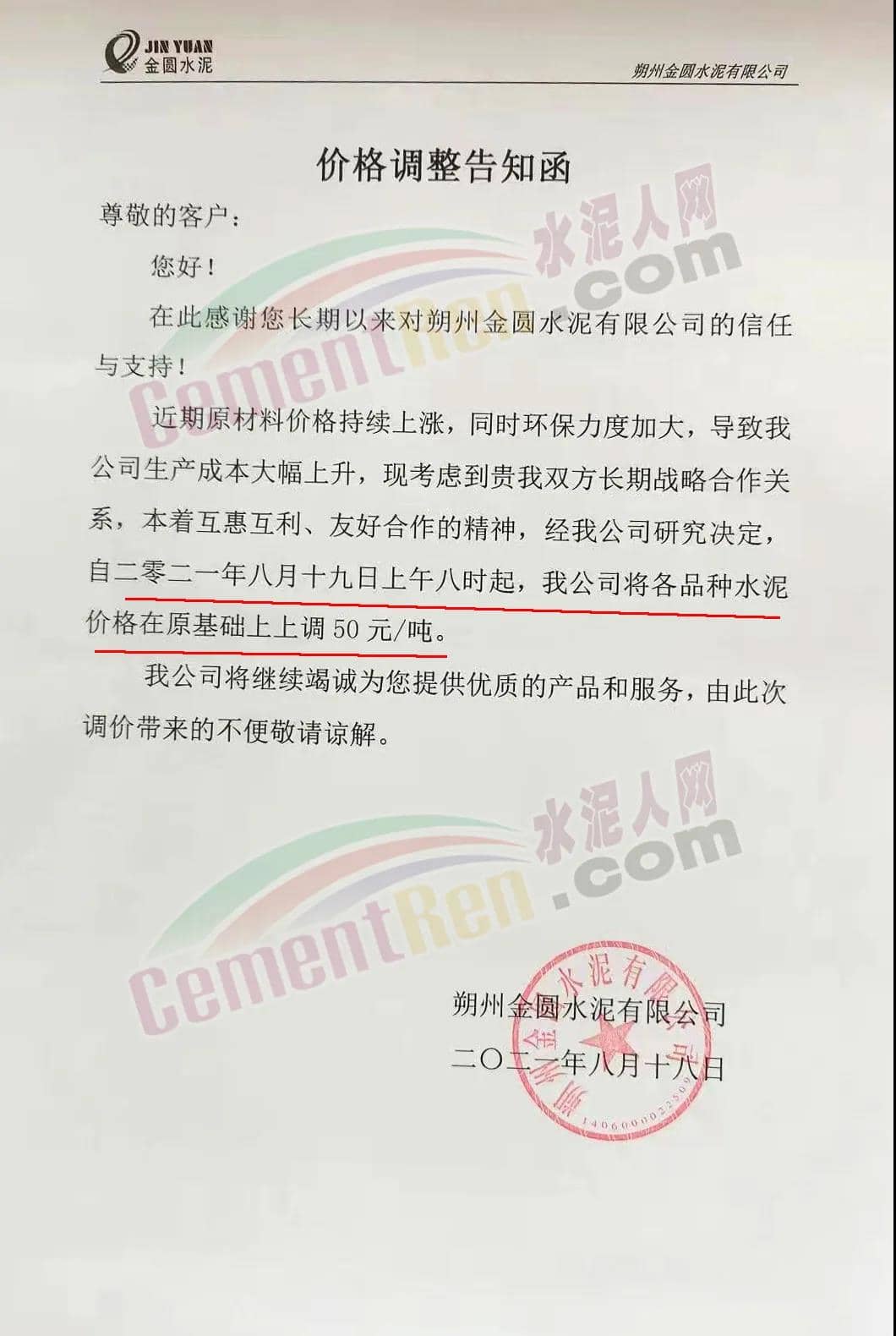 朔州金圆水泥有限公司通知近期原材料价格持续上涨,同时环保力度加大,导致公司生产成本大幅上升,经公司研究决定,自2021年8月19日上午8时起,将各品种水泥价格在原基础上上调50元/吨。