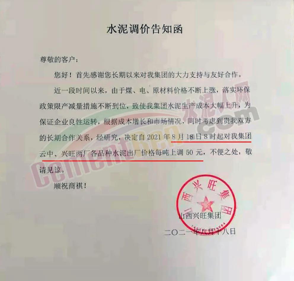 山西兴旺集团通知称,近一段时间以来,由于煤、电、原材料价格不断上涨,落实环保政策限产减量措施不断到位,致使企业水泥生产成本大幅上升,为保证企业良性运转,根据成本增长和市场情况,经研究决定自2021年8月18日8时起对集团云中、兴旺两厂各品种水泥出厂价格上调50元/吨。