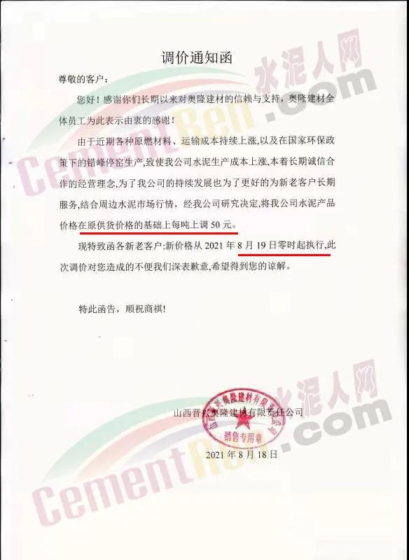 山西晋兴奥隆建材有限责任公司通知,由于近期各种原燃材料、运输成本持续上涨,以及在国家环保政策下的错峰停窑生产,致使公司水泥生产成本上涨,结合周边水泥市场行情,经公司研究决定,将水泥产品价格在原供货价格的基础上上调50元/吨,新价格从2021年8月19日零时起执行。