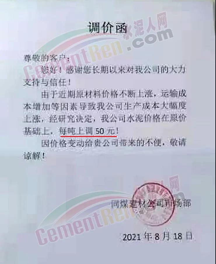 同煤建材公司市场部通知,由于近期原材料价格不断上涨,运输成本增加等因素导致公司生产成本大幅度上涨,经研究决定公司水泥价格在原价基础上上调50元/吨。