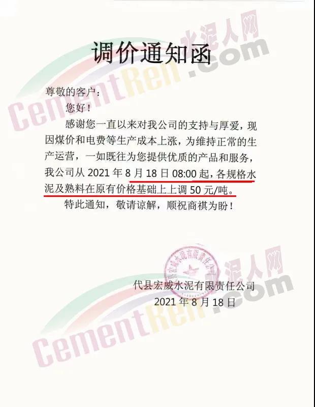 代县宏威水泥有限责任公司通知,因煤价和电费等生产成本上涨,为维持正常的生产运营,公司从2021年8月18日8时起,各规格水泥及熟料在原有价格基础上上调50元/吨。