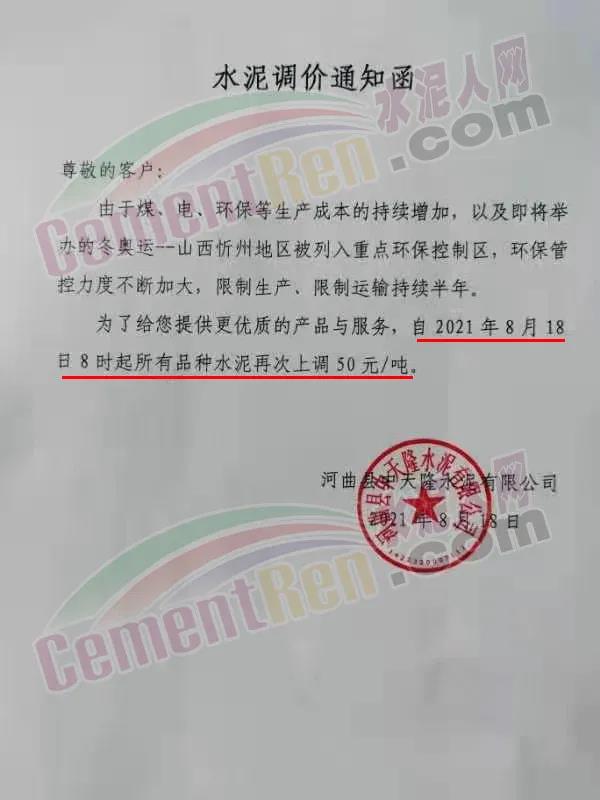 河曲县中天隆水泥有限公司通知,由于煤、电、环保等生产成本的持续增加,以及即将举办的冬奥运——山西忻州地区被列入重点环保控制区,环保管控力度不断加大,限制生产、限制运输持续半年。为了给客提供更优质的产品与服务,自2021年8月18日8时起所有品种水泥再次上调50元/吨。