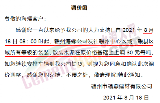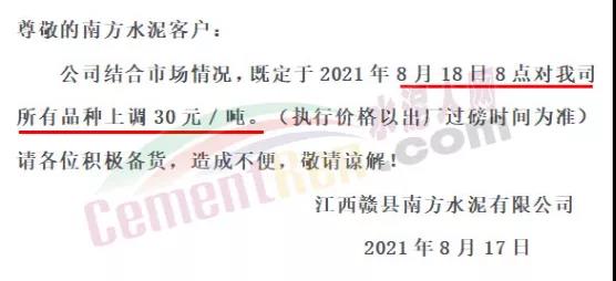 同日,江西赣州市赣鼎建材有限公司通知自2021年8月18日8时起,赣州海螺公司发往赣州中心区域、赣县区域所有等级的袋装,散装水泥在原价格基础上上调30元/吨。