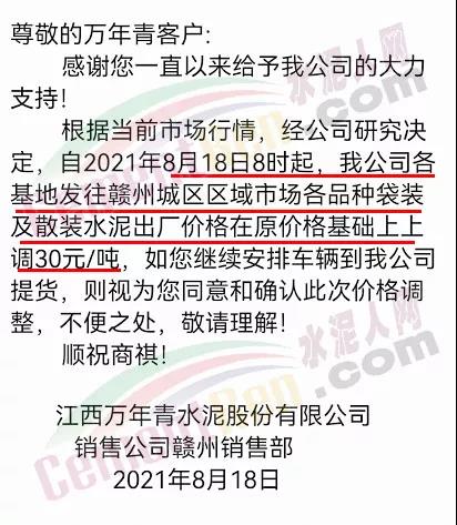 江西万年青水泥股份有限公司销售公司赣州销售部通知根据当前市场行情,经公司研究决定,自2021年8月18日8时起,公司各基地发往赣州城区区域市场各品种袋装及散装水泥出厂价格在原价格基础上上调30元/吨。