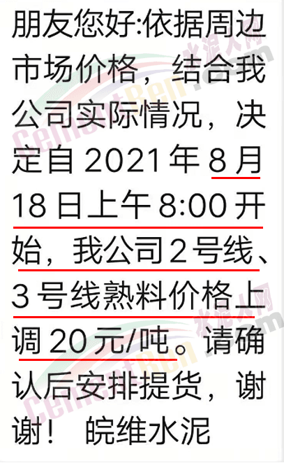 皖维水泥通知,依据周边市场价格,结合公司实际情况,决定自2021年8月18日上午8时开始,公司2号线、3号线熟料价格上调20元/吨。