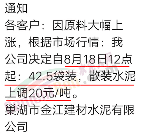 巢湖市金江建材水泥有限公司通知称,因原料大幅上涨,根据市场行情公司决定自8月18日12点起42.5袋装,散装水泥上调20元/吨。
