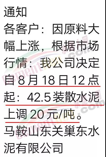 马鞍山东关巢东水泥有限公司通知因原料大幅上涨,根据市场行情公司决定自8月18日12点起42.5装散水泥上调20元/吨。
