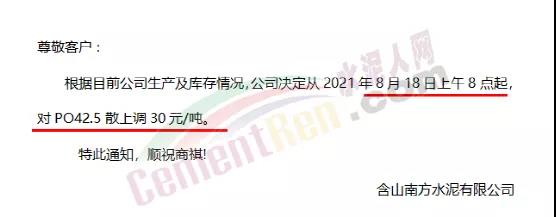 含山南方水泥有限公司通知根据目前公司生产及库存情况公司决定从2021年8月18日上午8点起,对PO42.5散上调30元/吨。