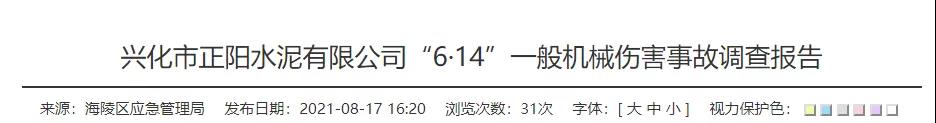 经调查认定,兴化市正阳水泥有限公司“6.14”一般机械伤害事故是一起生产安全责任事故。
