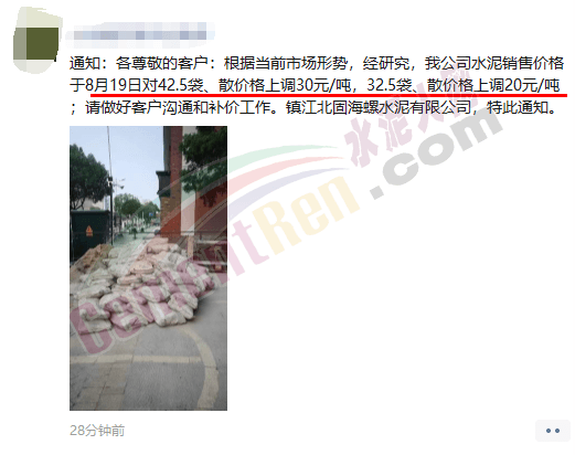 水泥人网通讯员消息:江苏镇江北固海螺水泥有限公司通知于8月19日对42.5袋、散价格上调30元/吨,32.5袋、散价格上调20元/吨。