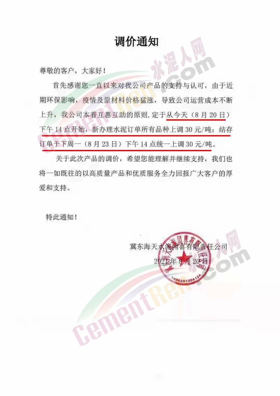 冀东海天水泥闻喜公司通知由于近期环保影响以及原材料价格猛涨,导致公司运营成本不断上升,本着互惠互助的原则,定于从8月20日下午14点开始,新办理水泥订单所有品种上调30元/吨;结存订单于8月23日下午14点统一上调30元/吨。