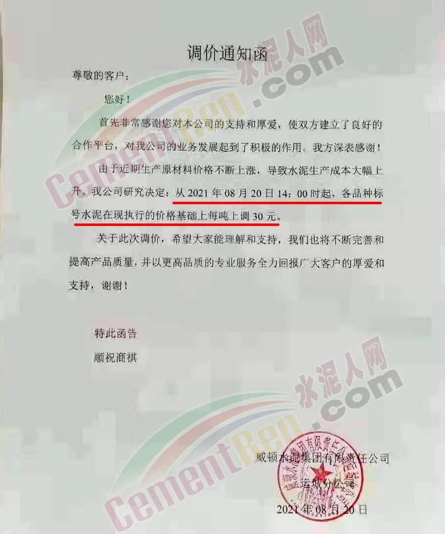威顿水泥集团有限责任公司通知,由于近期生产原材料价格不断上涨,导致水泥生产成本大幅上升。经公司研究决定从2021年8月20日14时起,各品种标号水泥在现执行的价格基础上上调30元/吨。