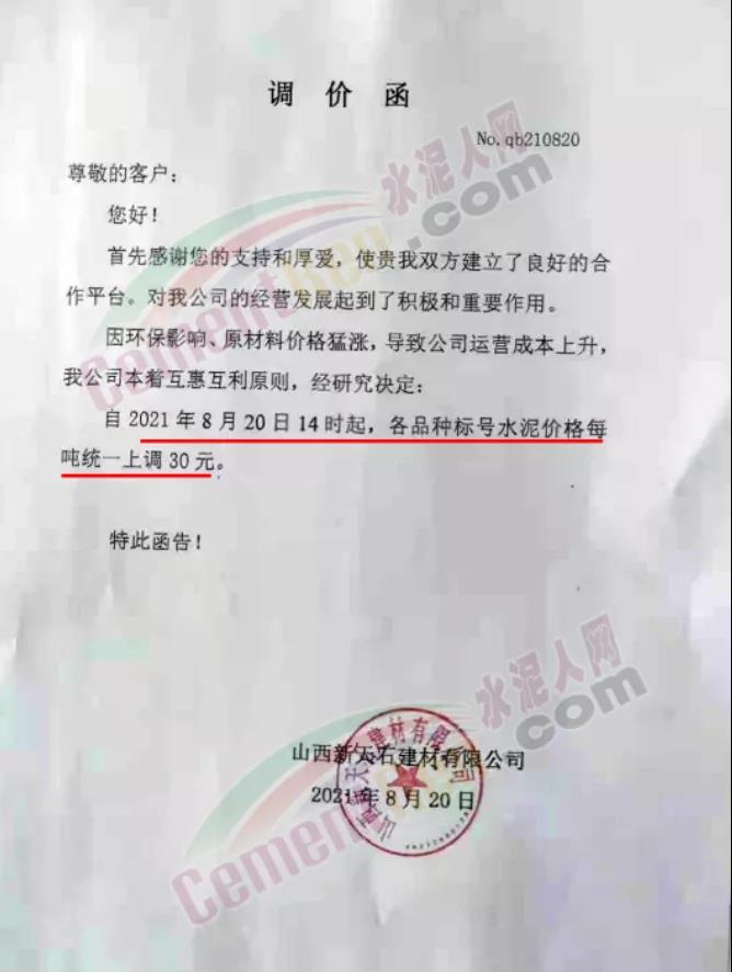 山西新天石建材有限公司通知因环保影响、原材料价格猛涨,导致公司运营成本上升,我公司本着互惠互利原则,经研究决定自2021年8月20日14时起,各品种标号水泥价格统一上调30元/吨。