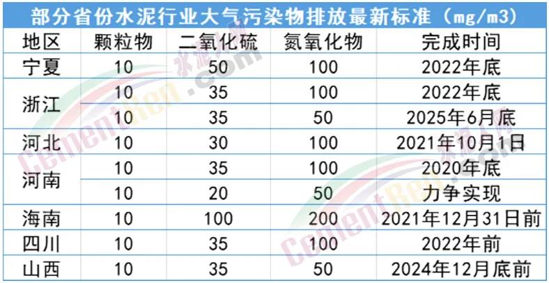 今年以来,宁夏、浙江、河北、河南、海南、四川、山西等水泥大省及部分地区,再次明确了本地的超低排放指标。对氮氧化物的限值,有的已严到50mg/m3以下。