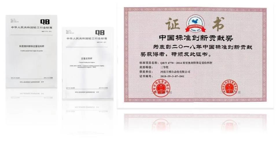 丰博自动化是一家从事动态计量行业20多年的老牌企业,成立了动态计量研究院,并拥有完备的固体颗粒状物料连续计量的实验装置和先进的粉体连续计量实验装置。在计量研究上,荣获多项国家专利及软件著作权。并且,由经河南省质量技术监督局推荐,丰博自动化负责牵头领衔制定的行业标准《QB/T4770-2014科里奥利粉体定量给料秤》项目,荣获2018年中国标准创新贡献奖三等奖。