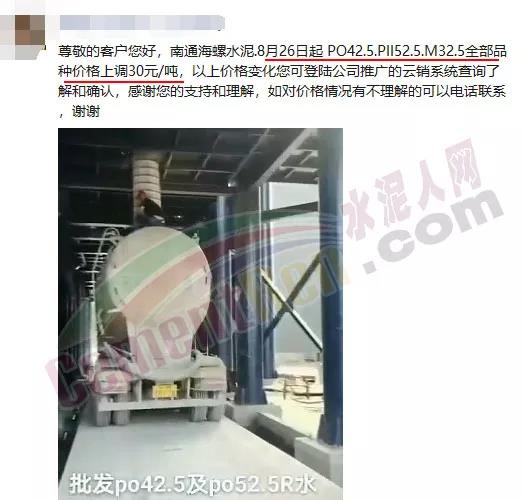 江苏南通海螺通知,自8月26日起PO42.5、PII52.5、M32.5全部品种价格上调30元/吨。