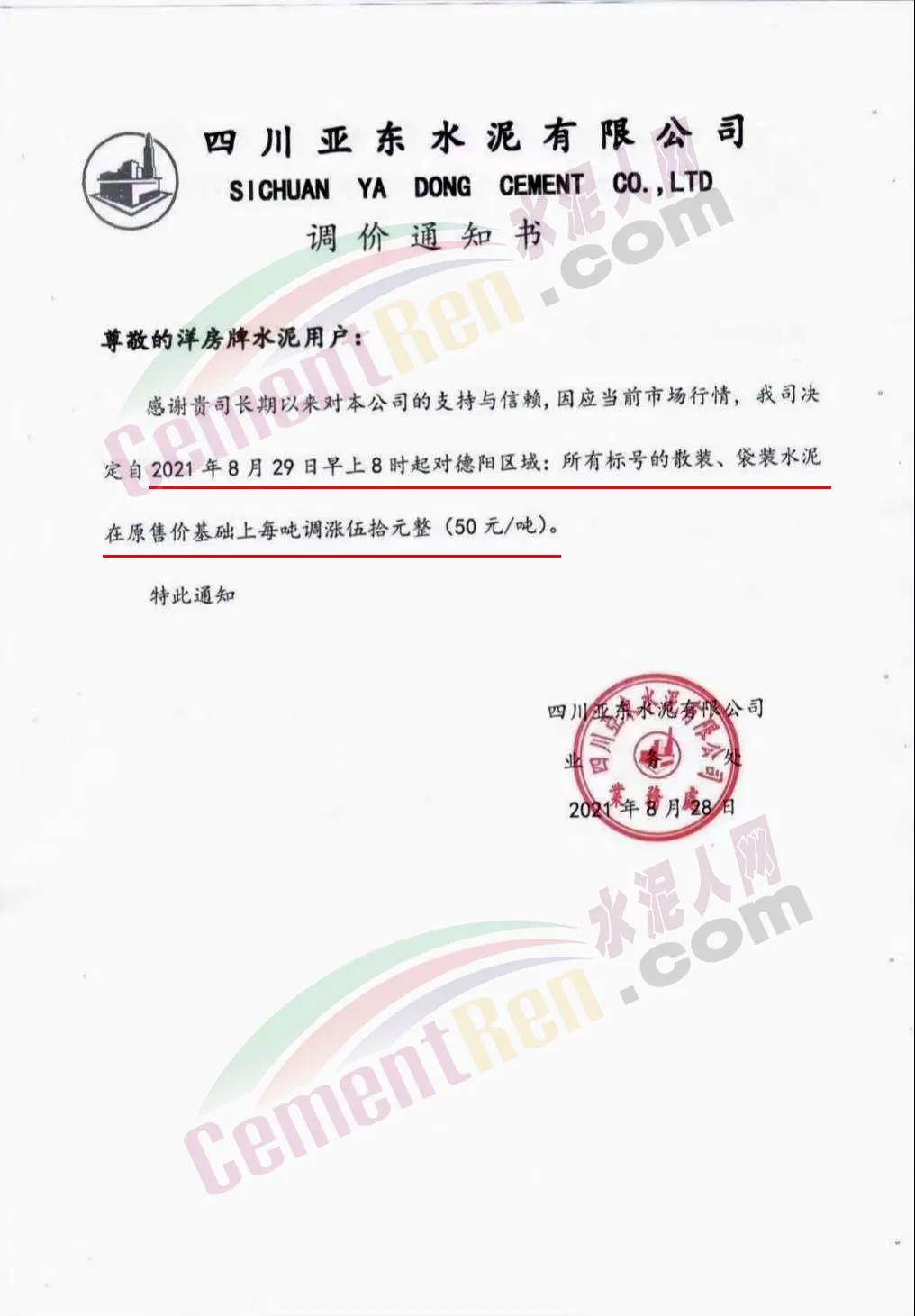 四川亚东水泥通知,自8月29日8时起,对德阳区域所有标号的散装、袋装水泥在原售价基础上调涨50元/吨。