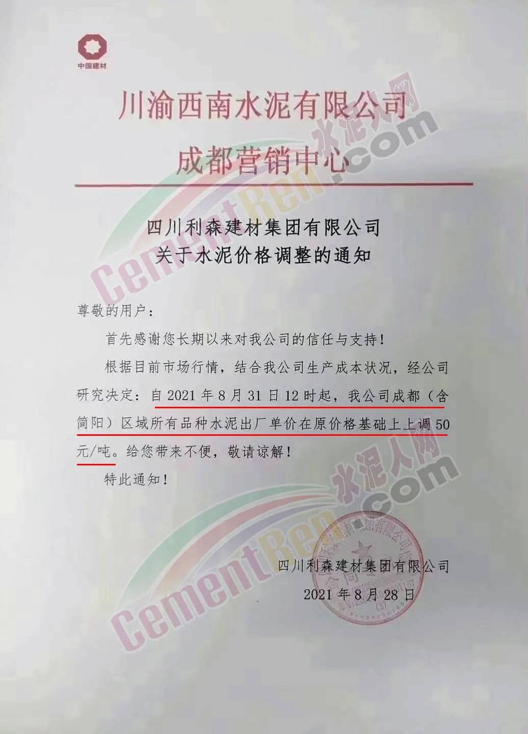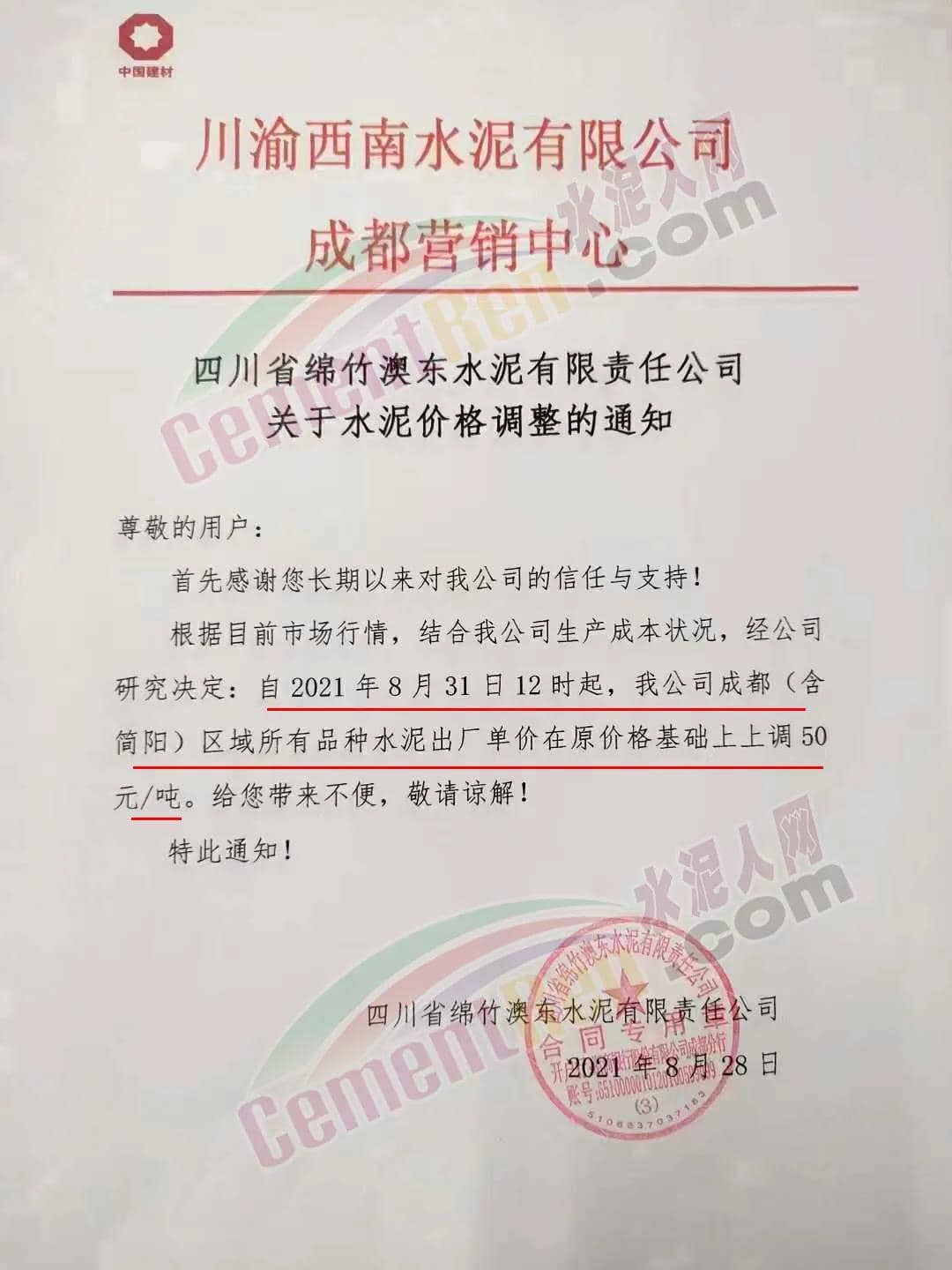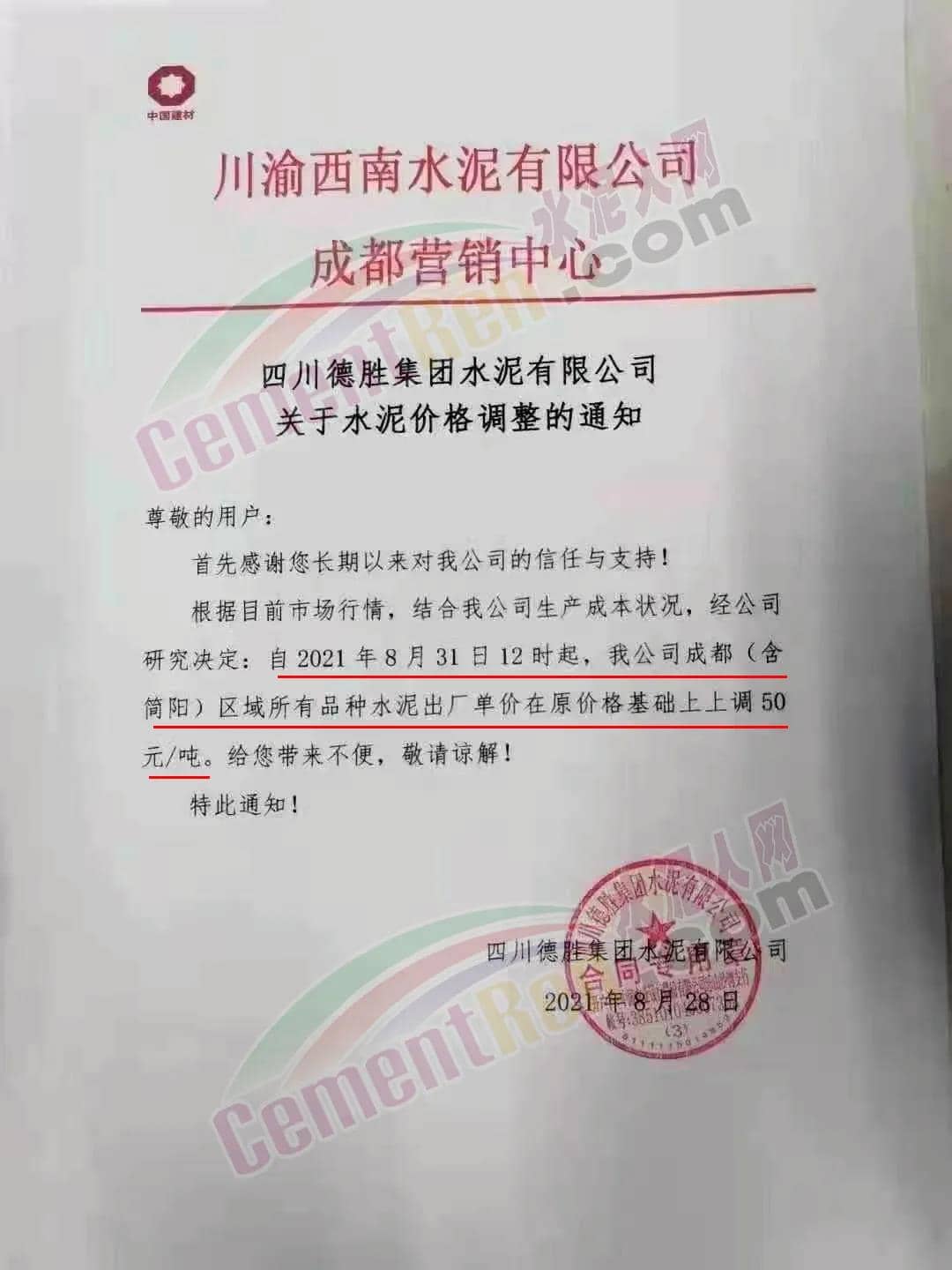 安县中联水泥、崇州西南水泥、四川德胜集团、峨眉山西南水泥、四川利森集团、绵竹澳东水泥、女娲建材等通知称,根据目前市场行情 ,结合公司生产成本状态,经公司研究决定自8月31日12时起,成都(含简阳)区域所有品牌水泥出厂单价在原价基础上上调50元/吨。